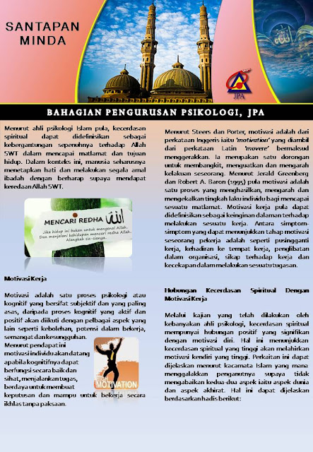 Santapan minda kali ini, ingin mengajak para pembaca sekalian menghayati artikel Perkaitan Kecerdasan Spiritual dan Motivasi Kerja, hasil sumbangan Encik Mohd Haikal Anuar Bin Adnan dari Bahagian Pengurusan Psikologi JPA.